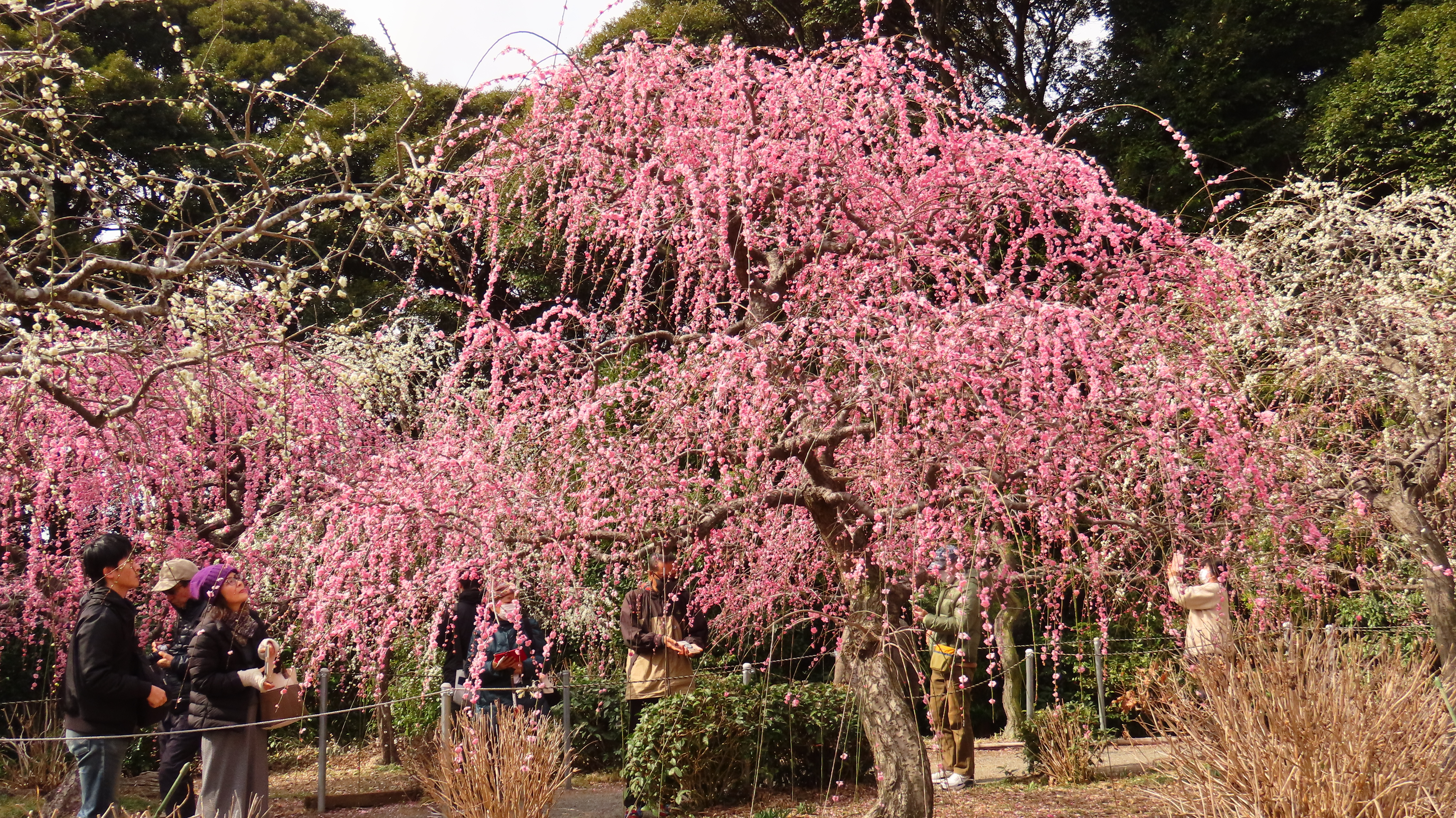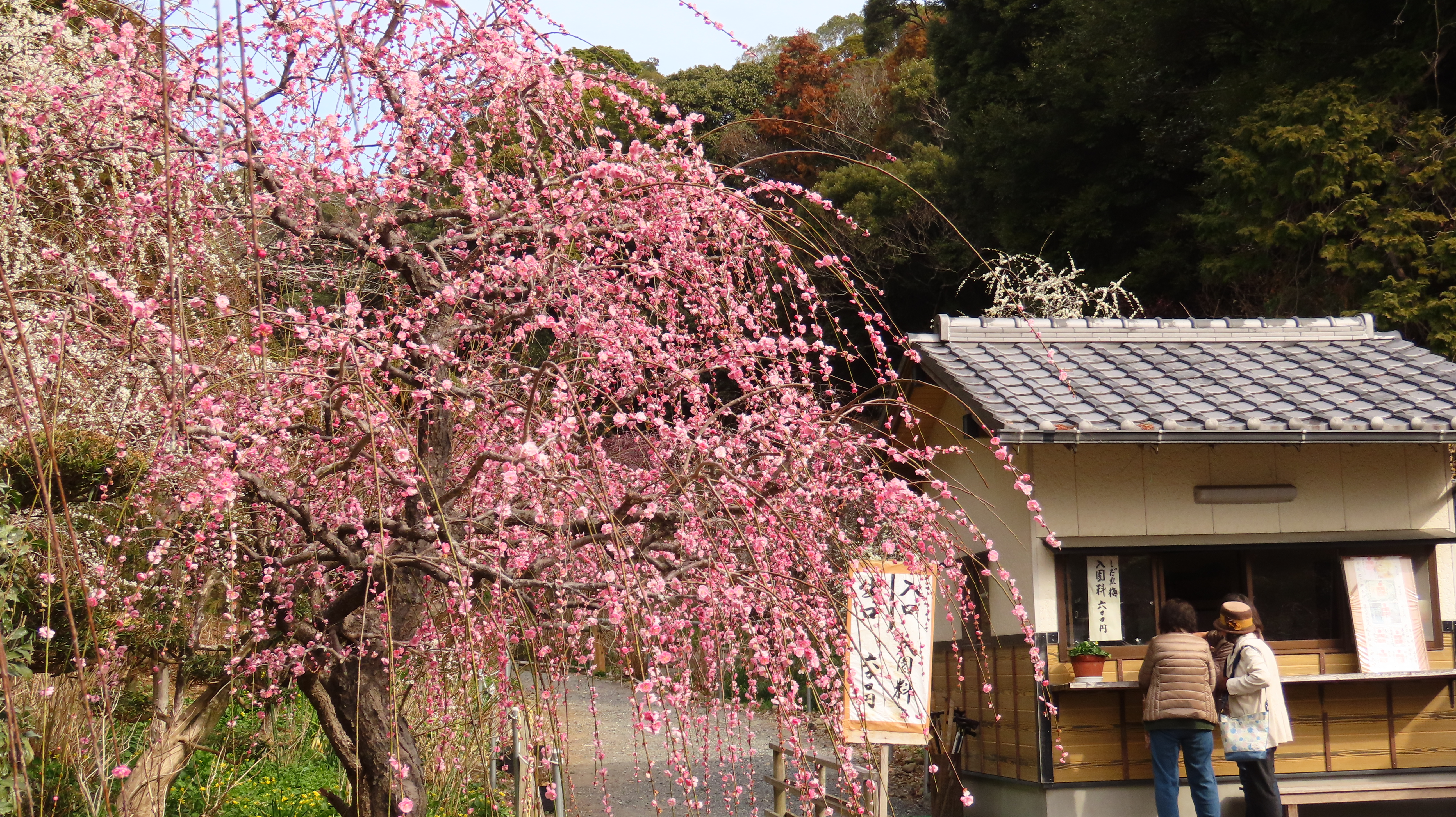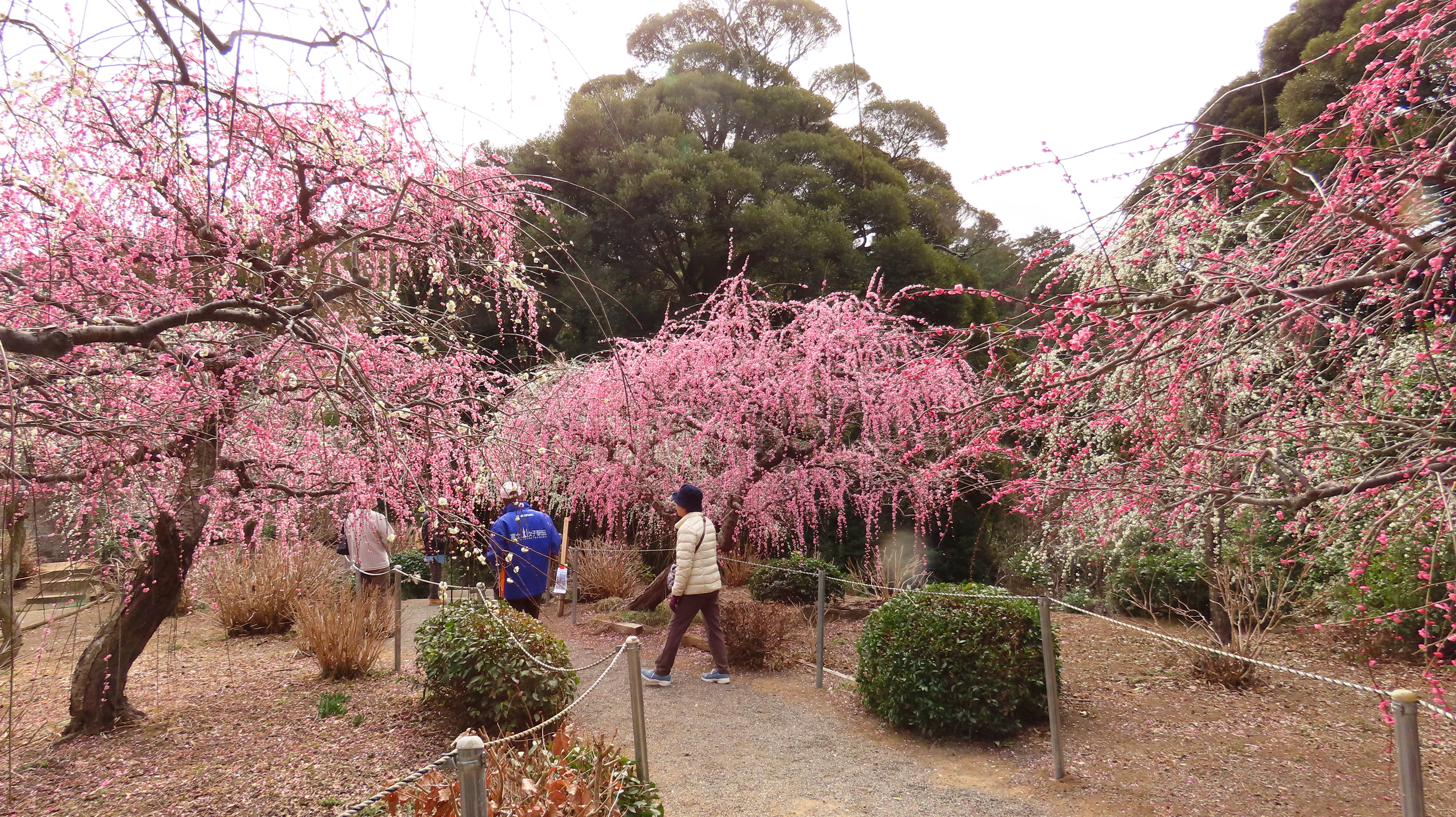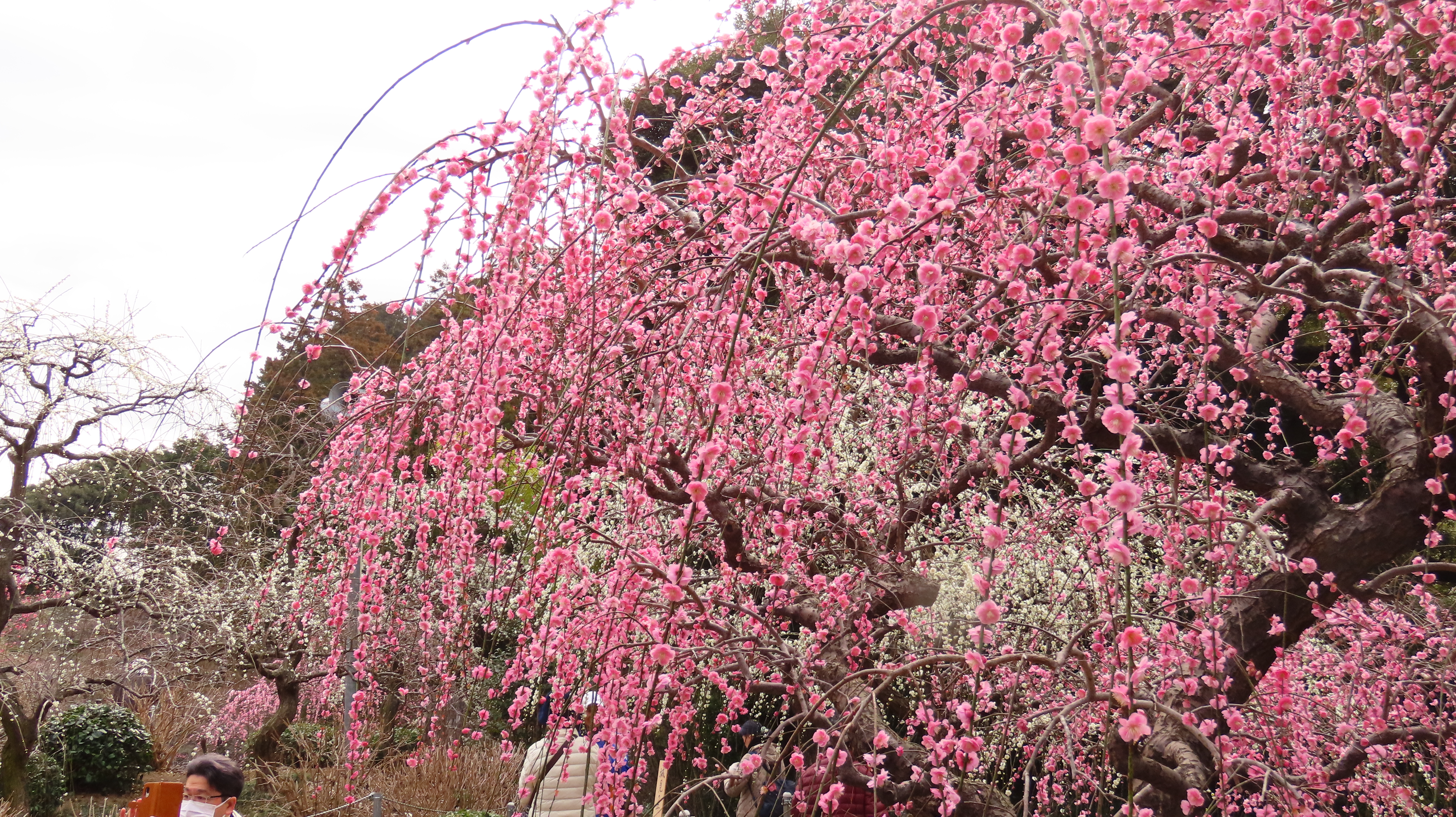 龍尾神社に隣接する花庭園では約300本の紅・桃・白のしだれ梅が綺麗です。