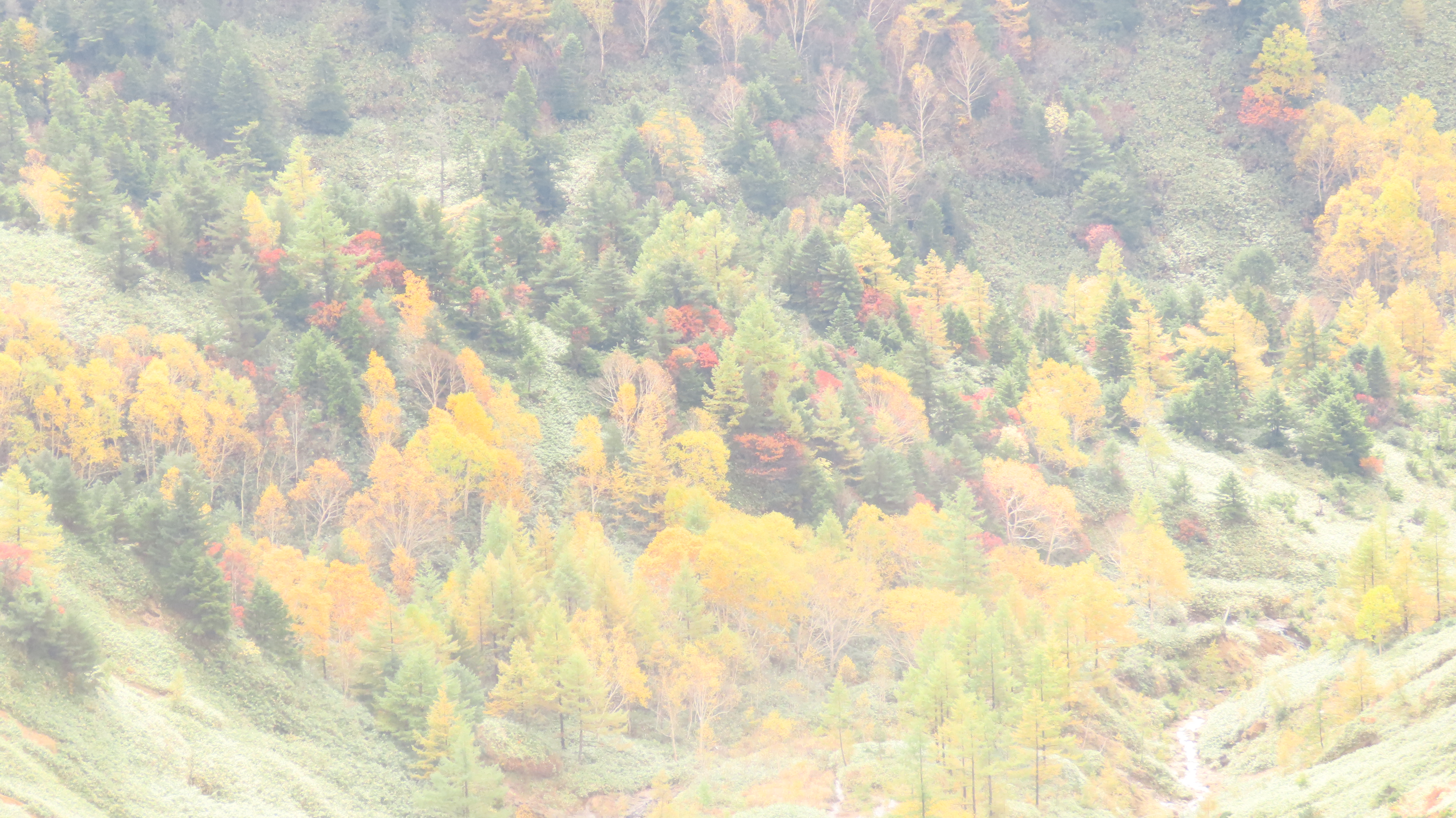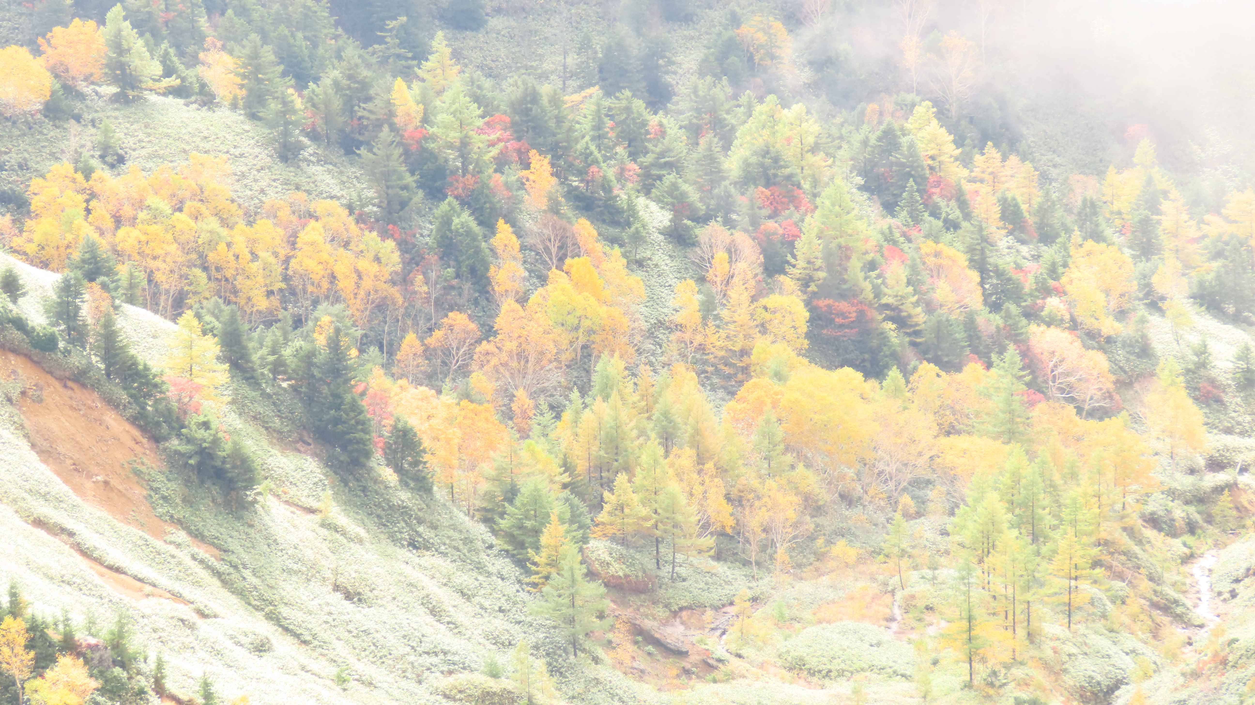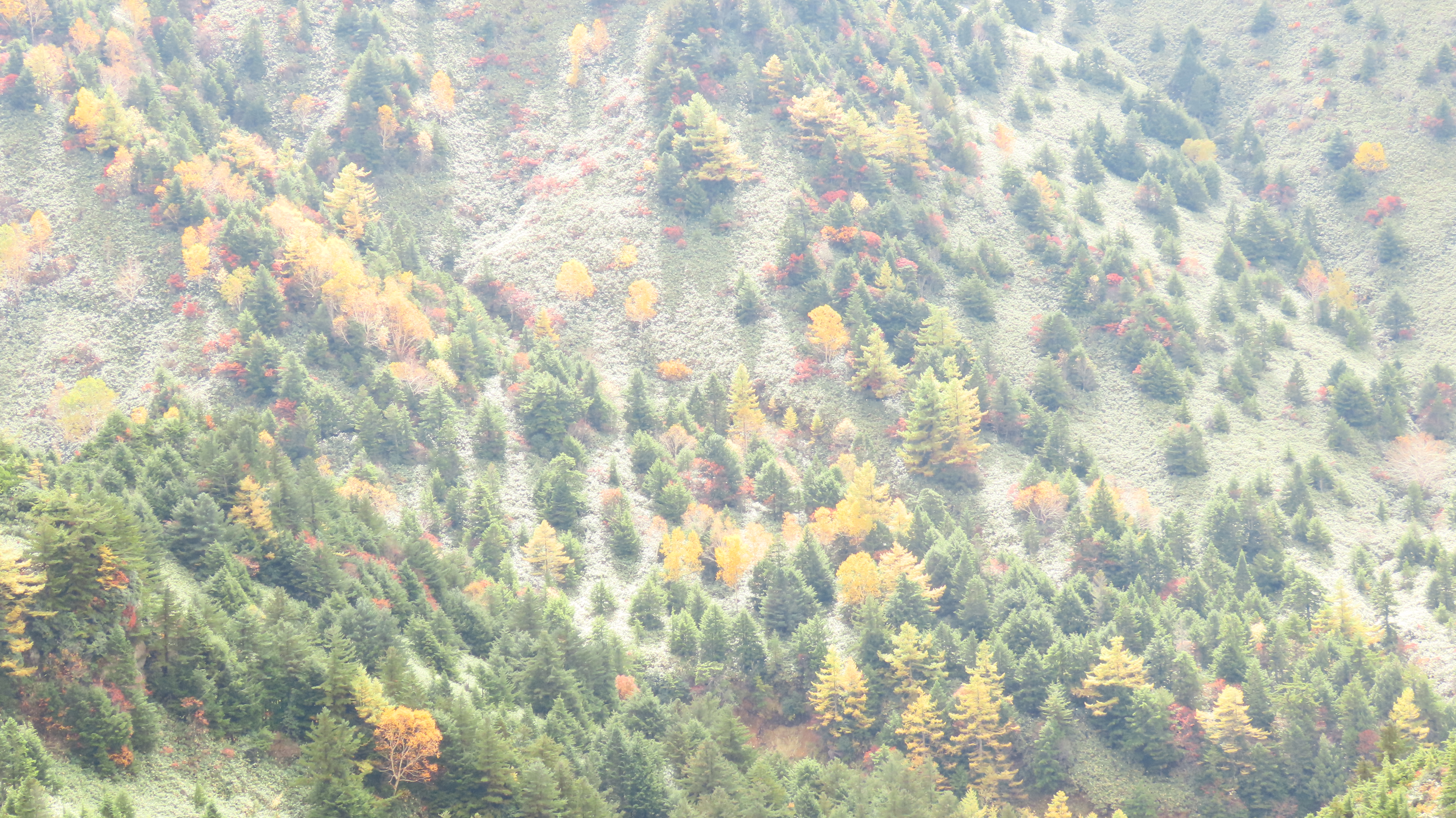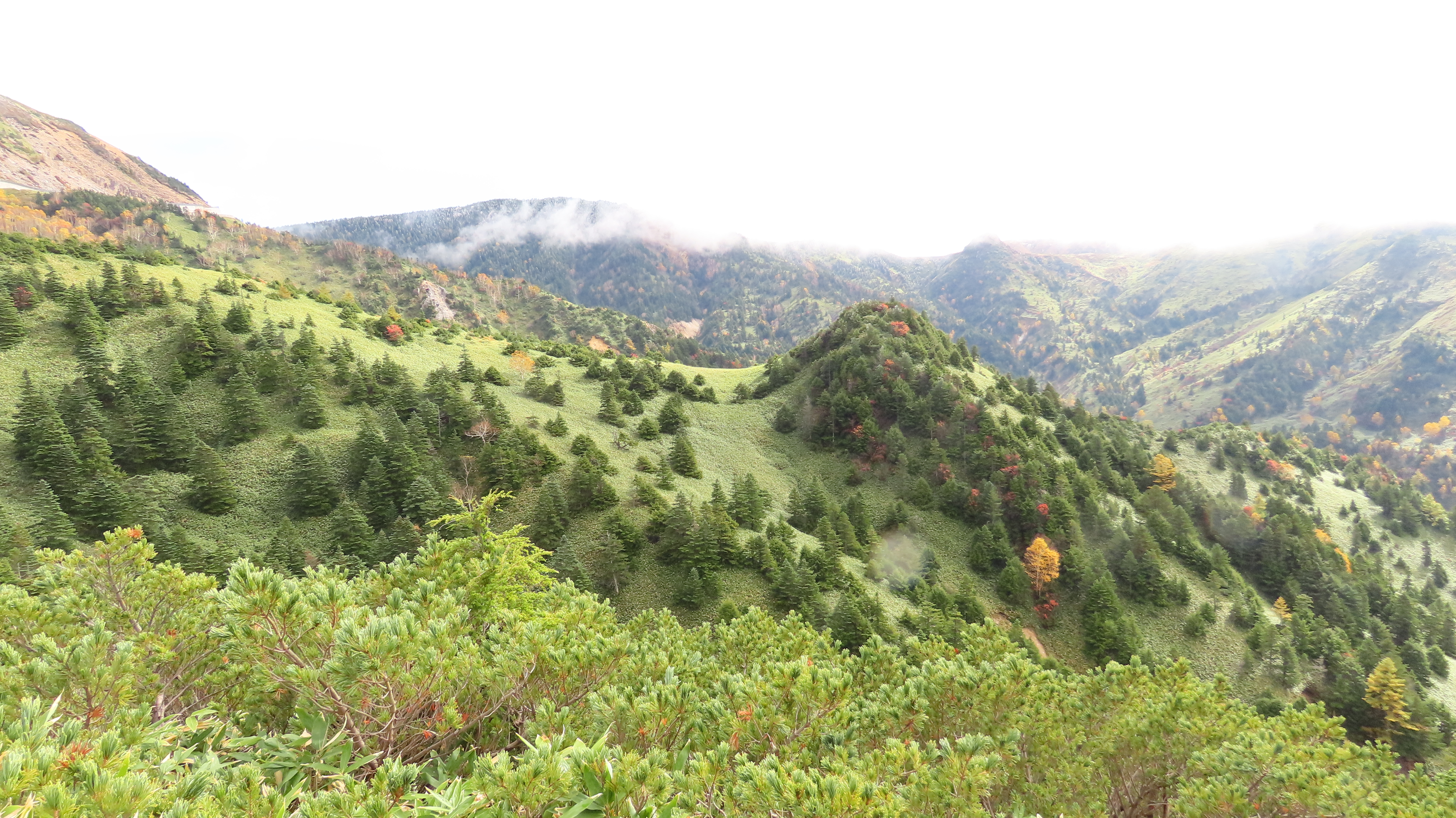 横手山ののぞきからは熊笹の下地に赤黄色の木々が点々と