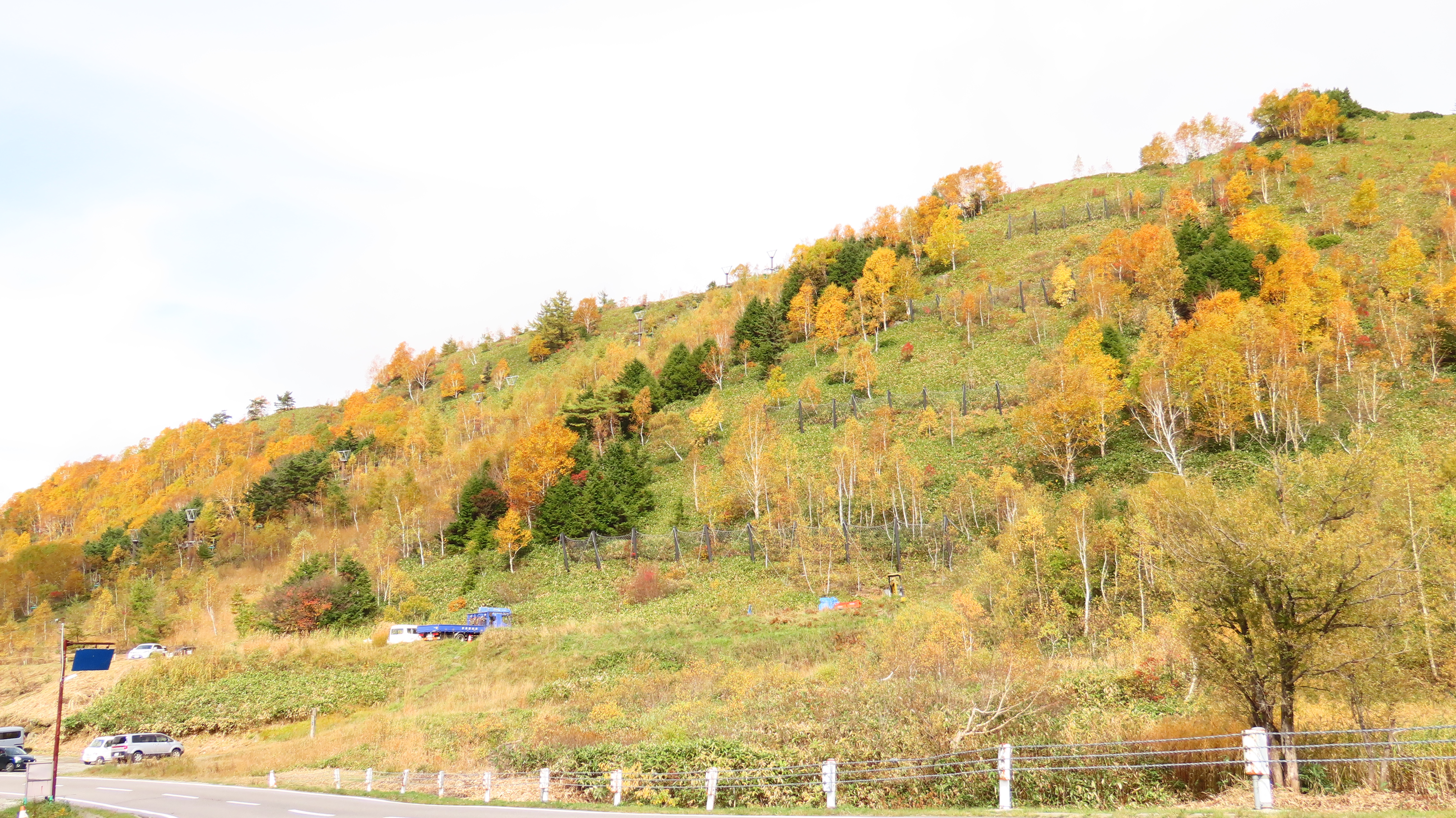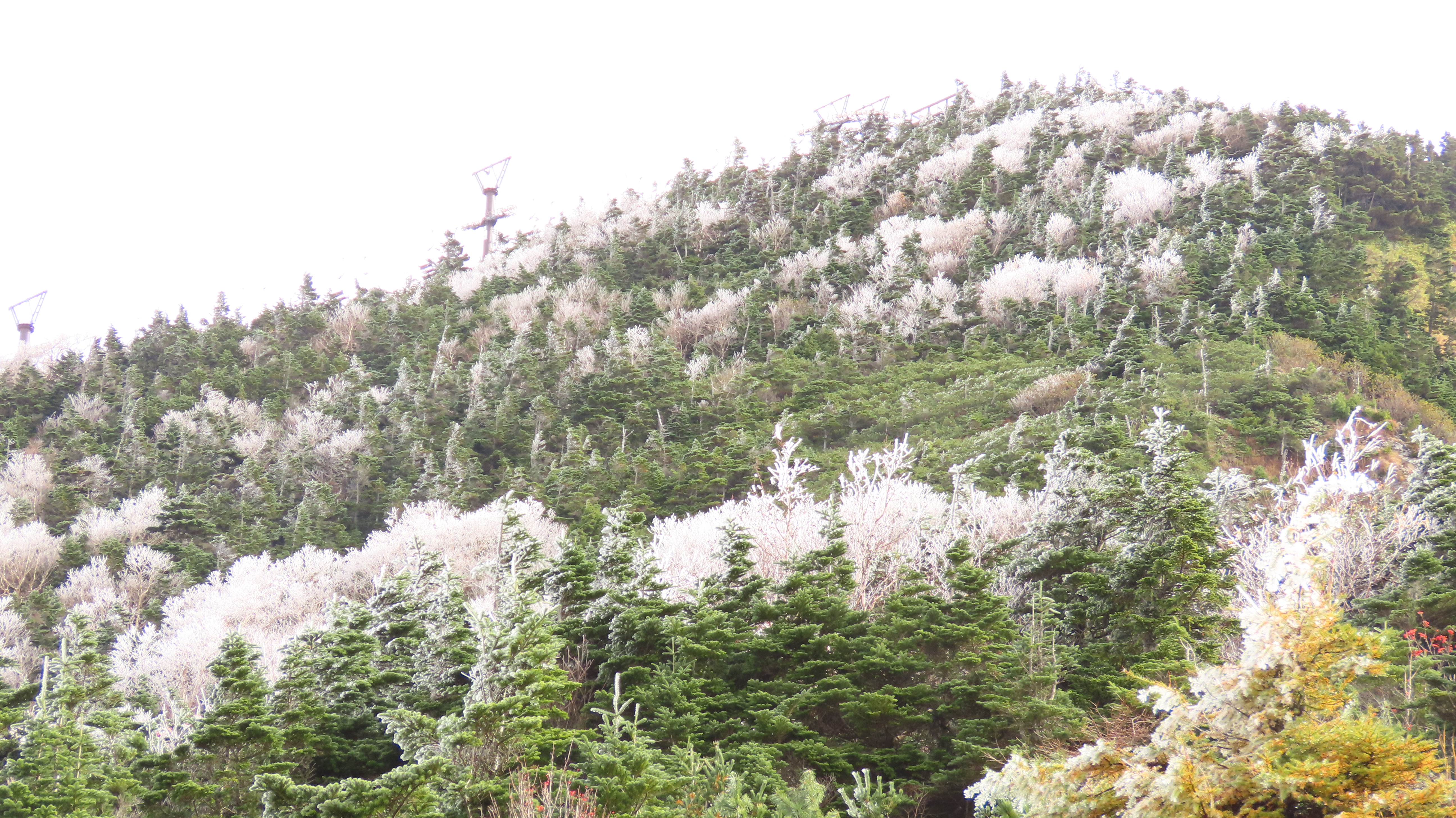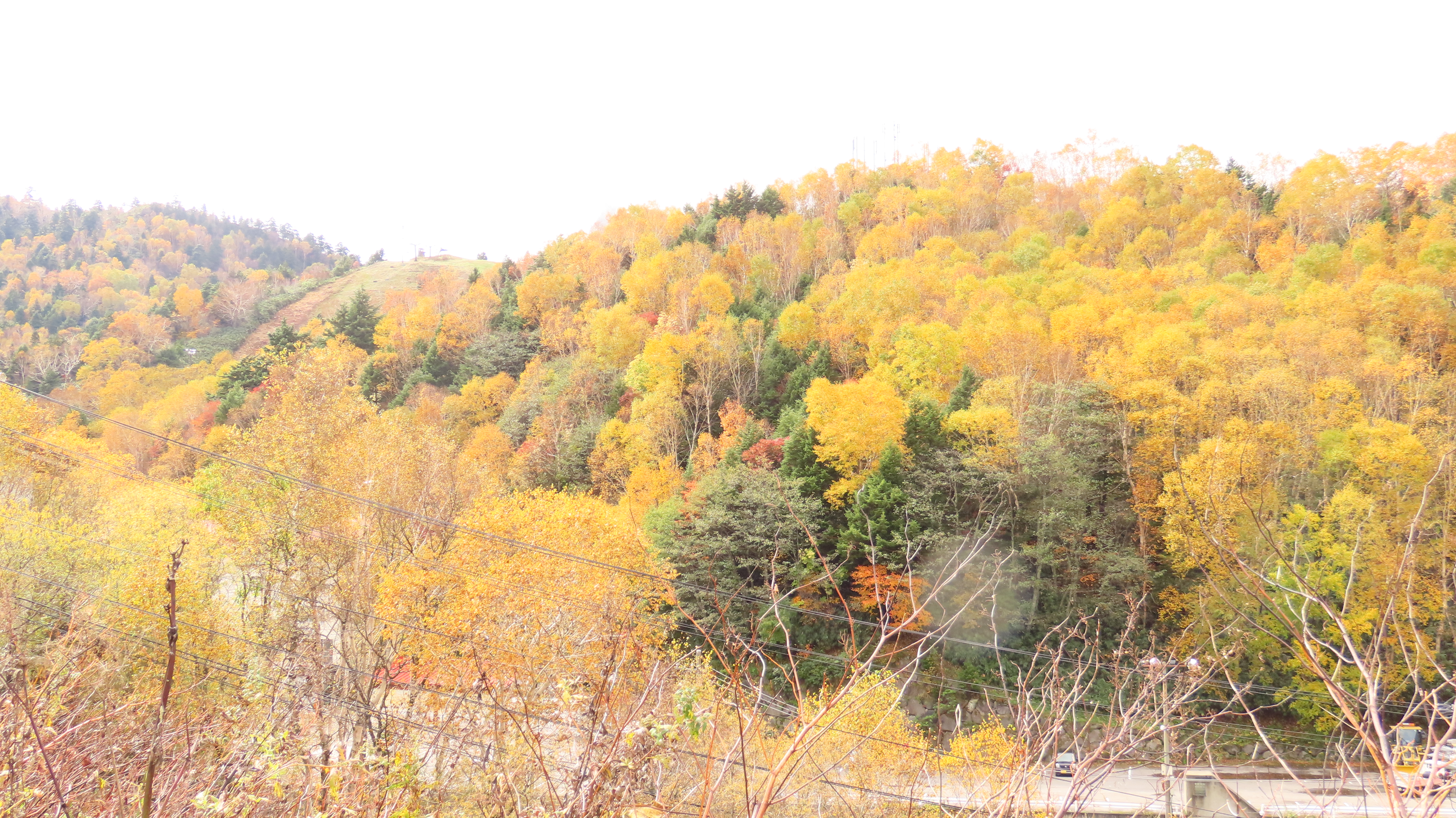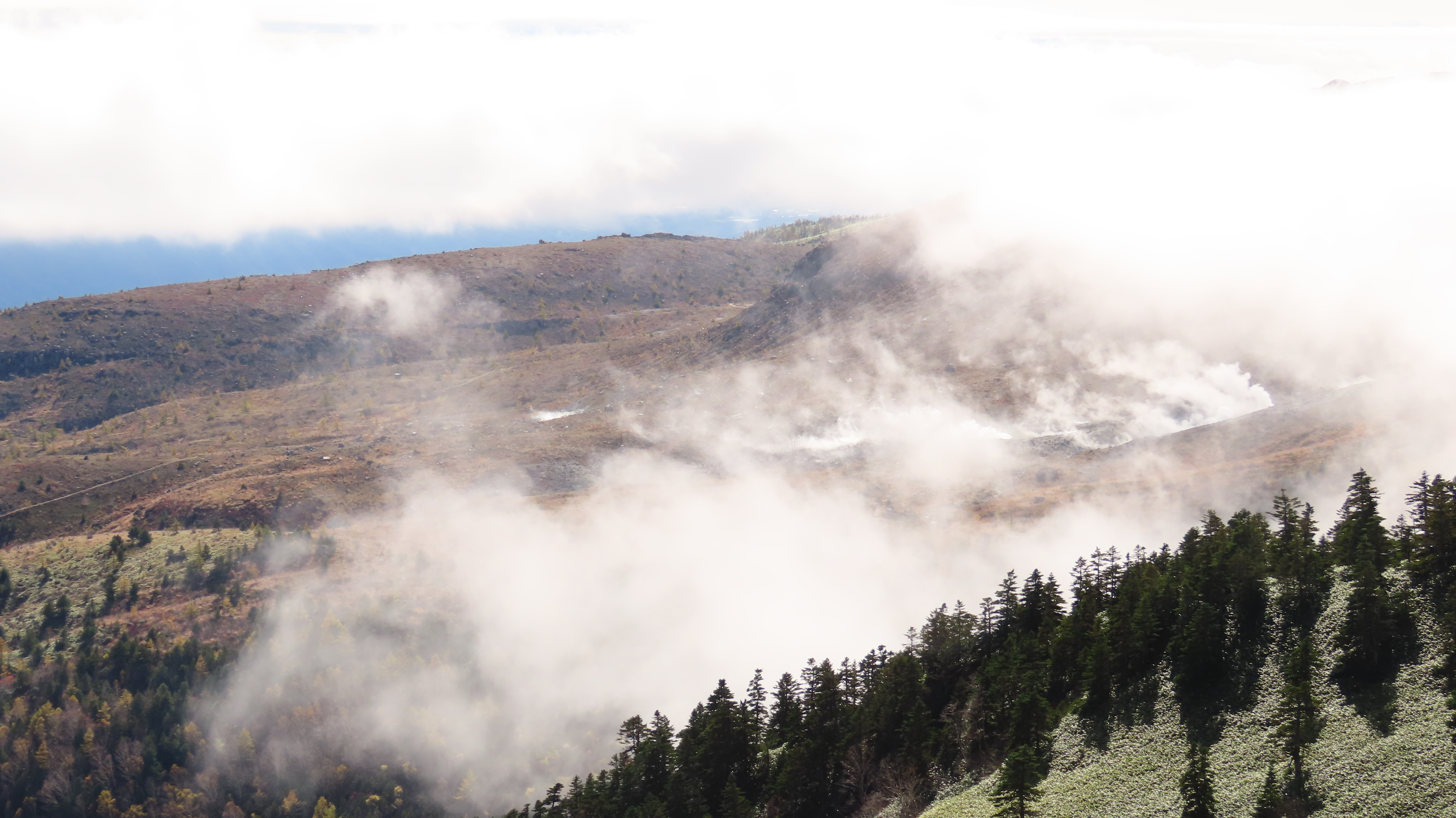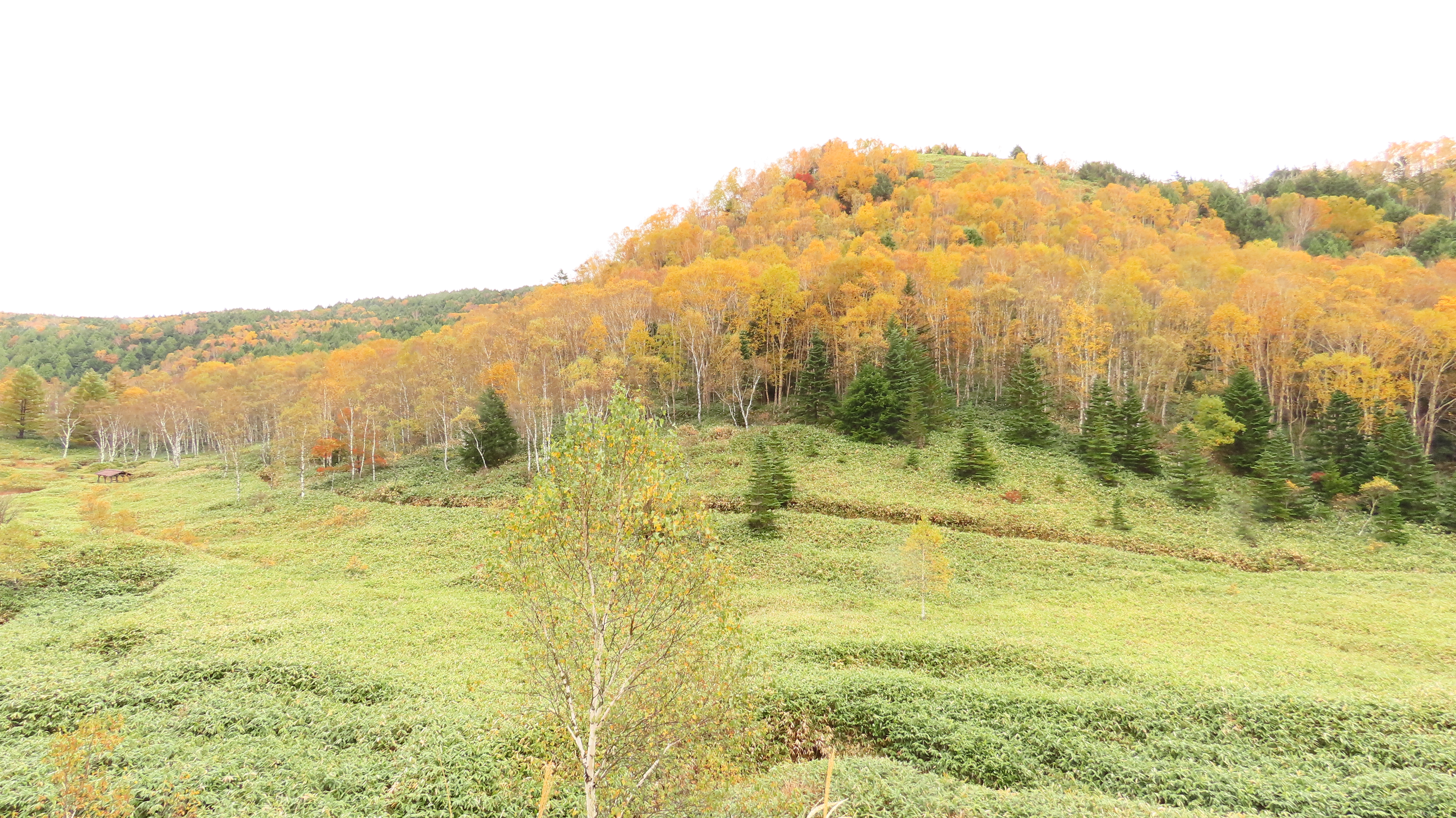 横手山ののぞきからは熊笹の下地に赤黄色の木々が点々と