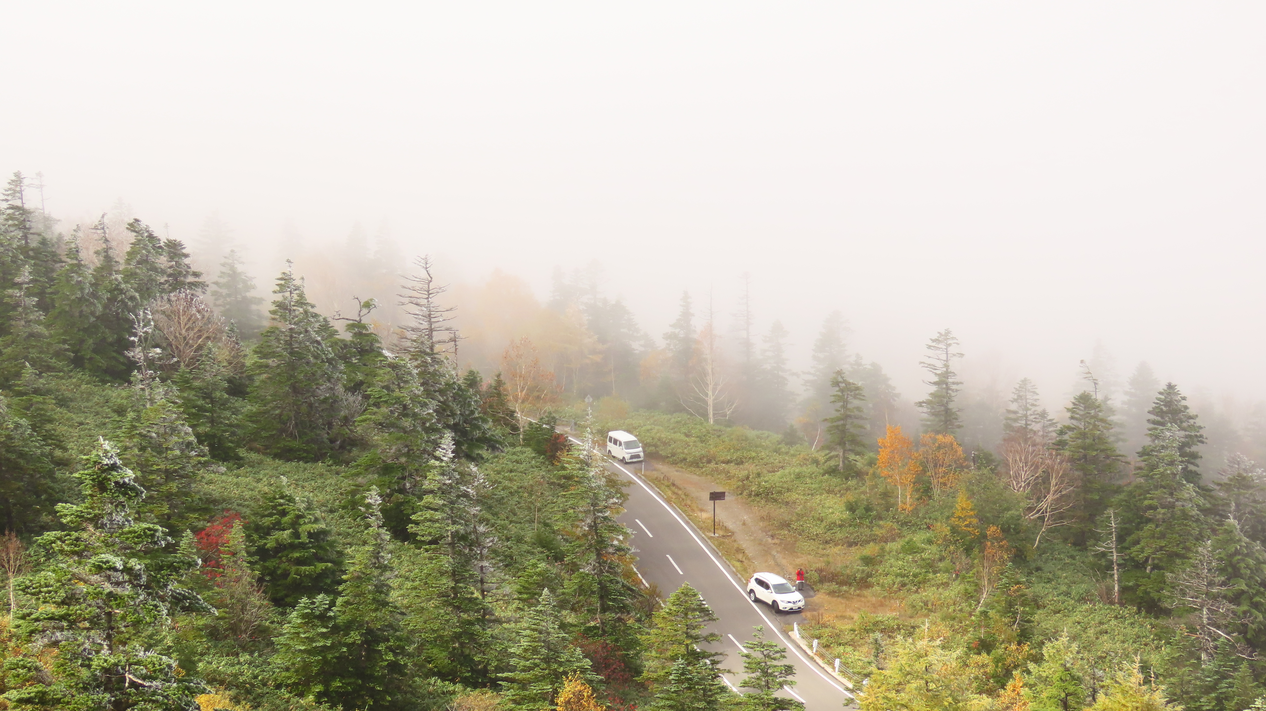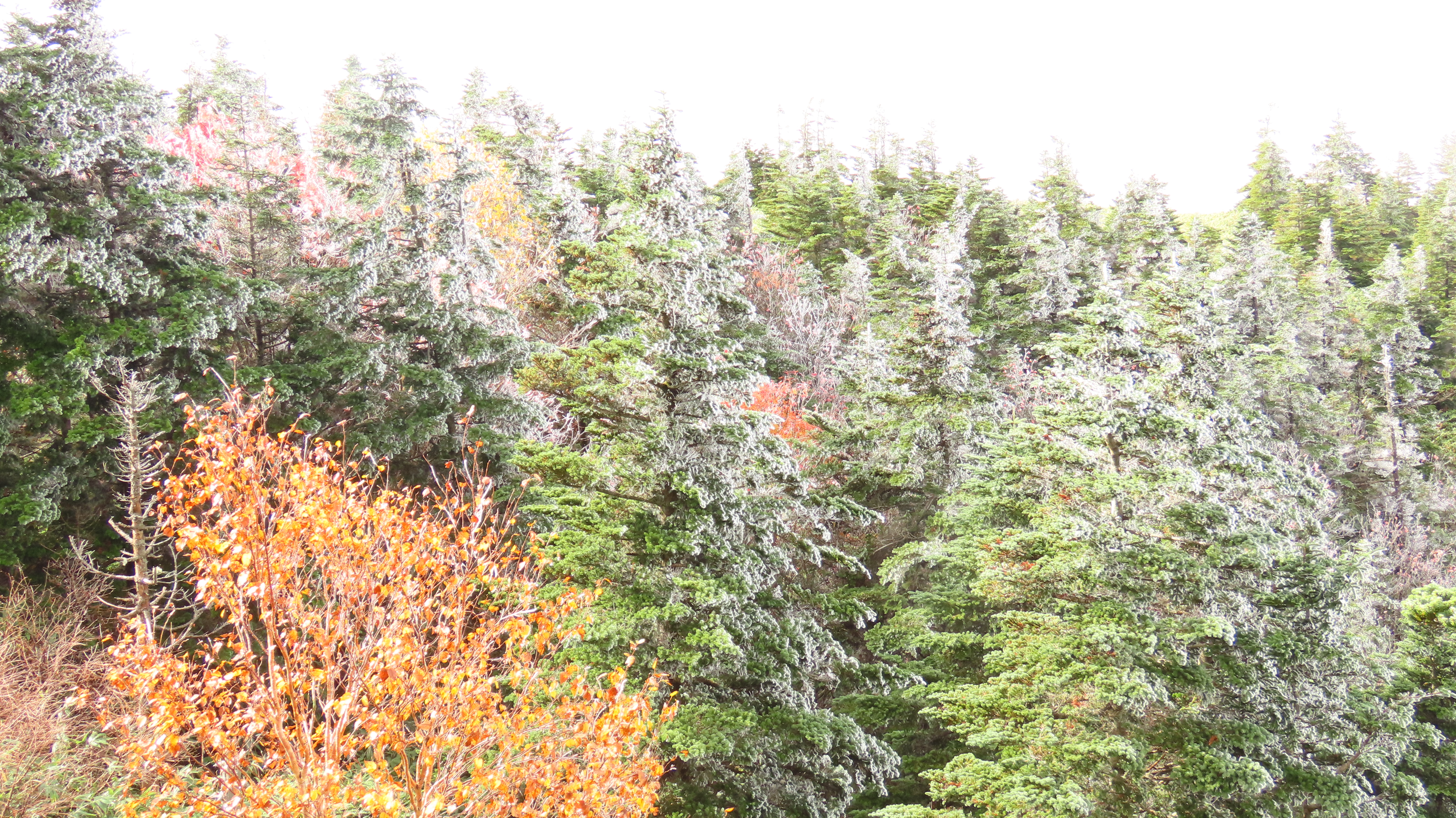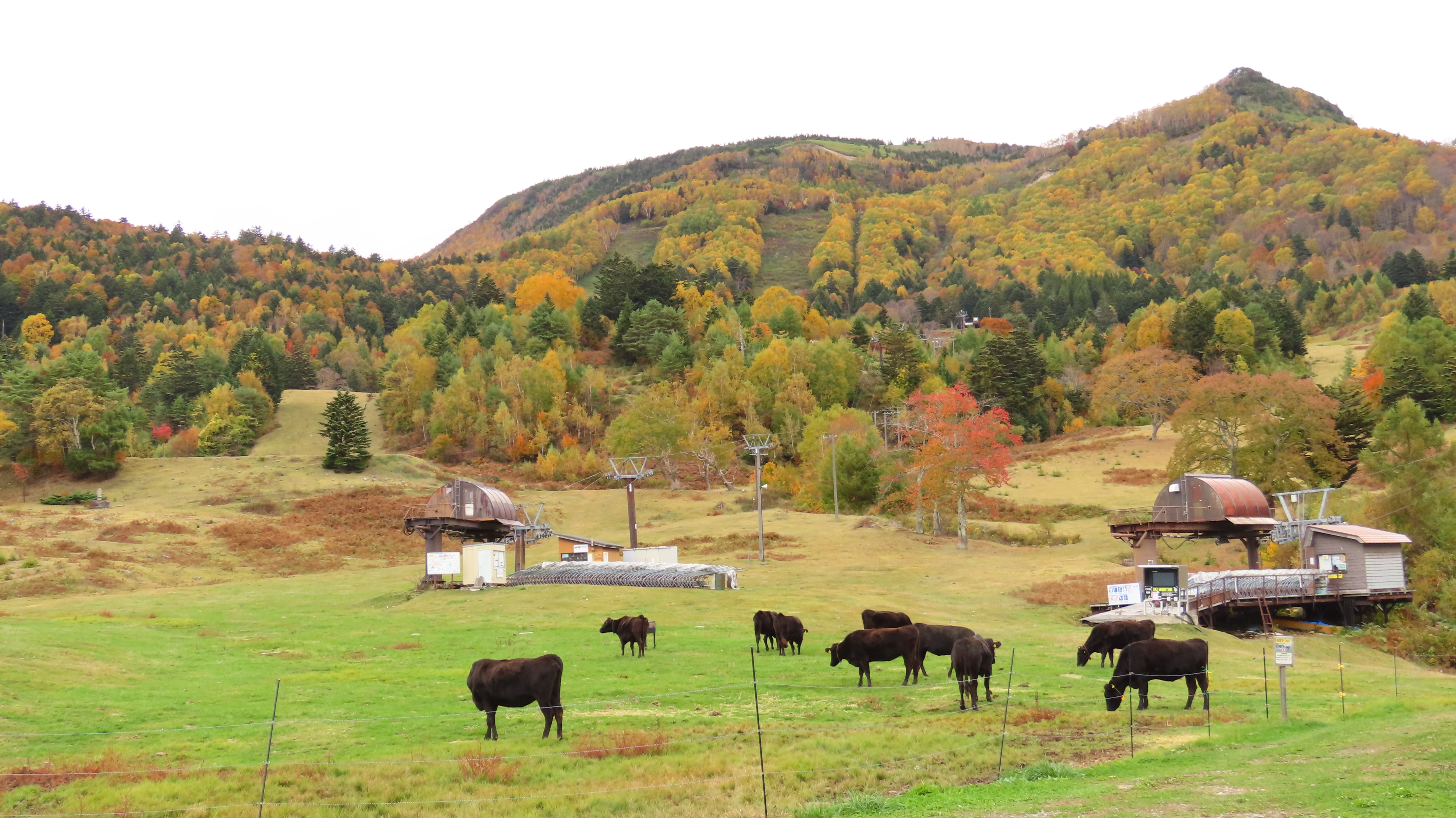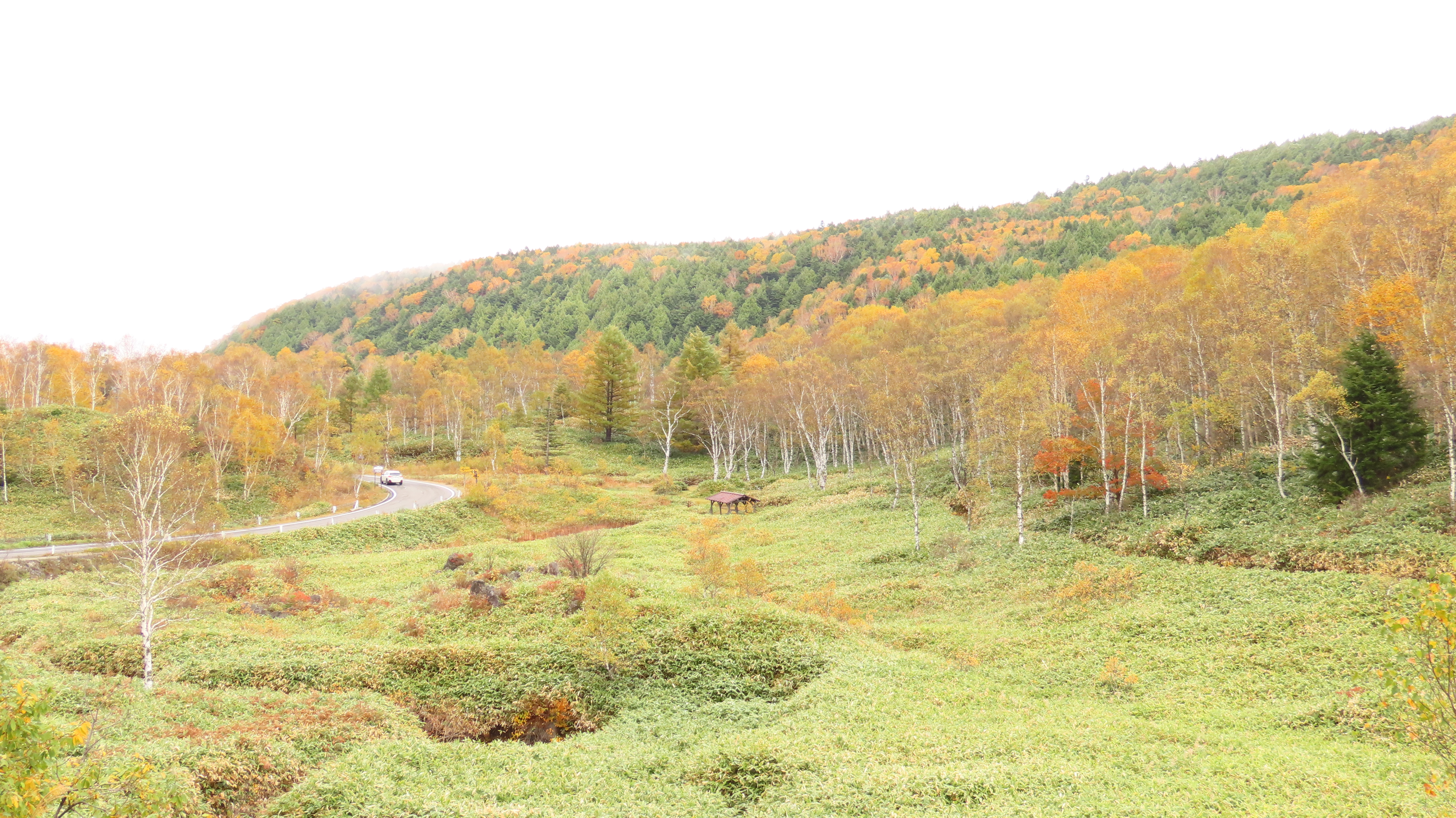 横手山ののぞきからは熊笹の下地に赤黄色の木々が点々と