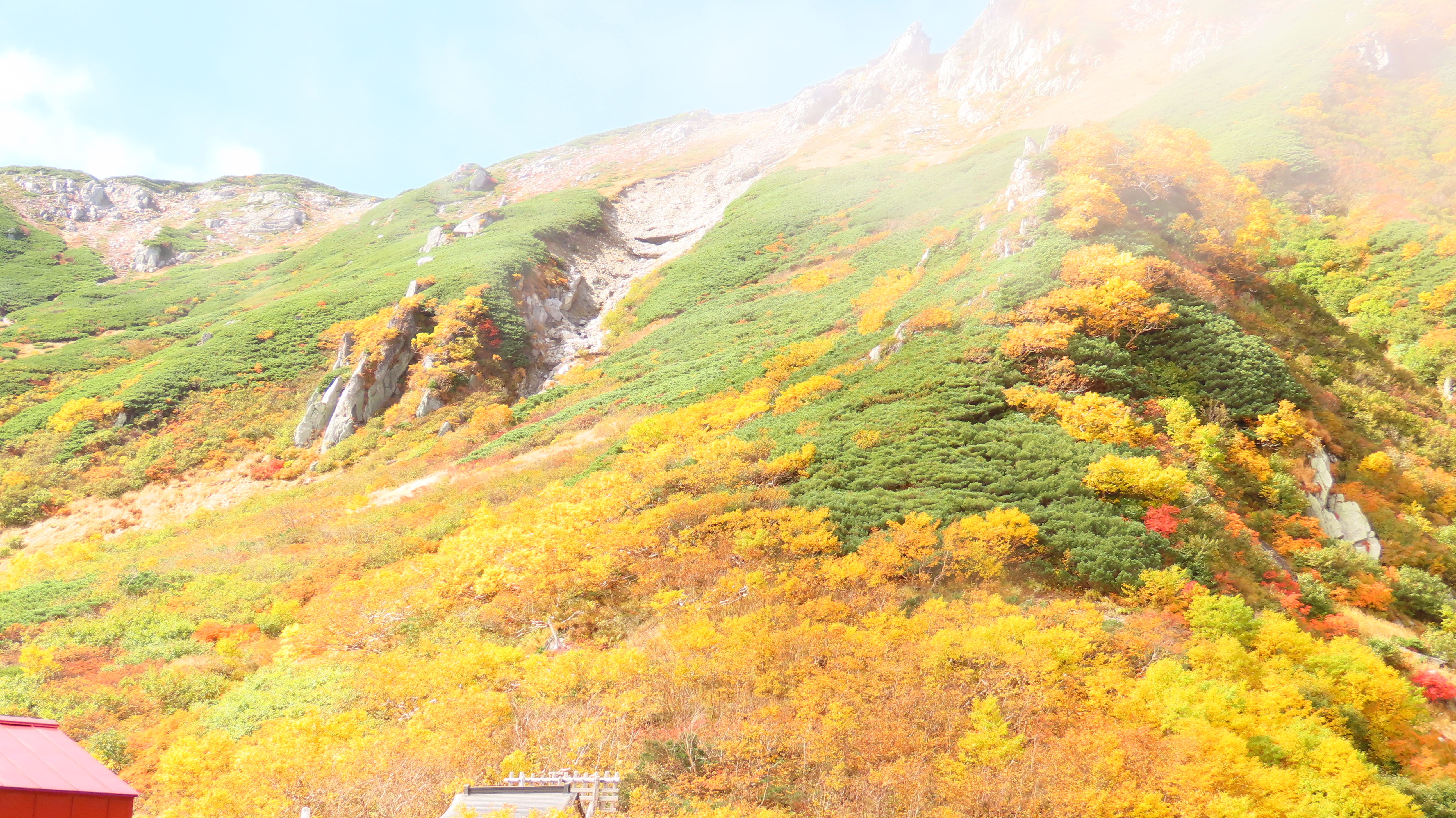 ロープウェイ千畳敷駅手前からカール全体が、赤色、黄色、オレンジ、緑色が